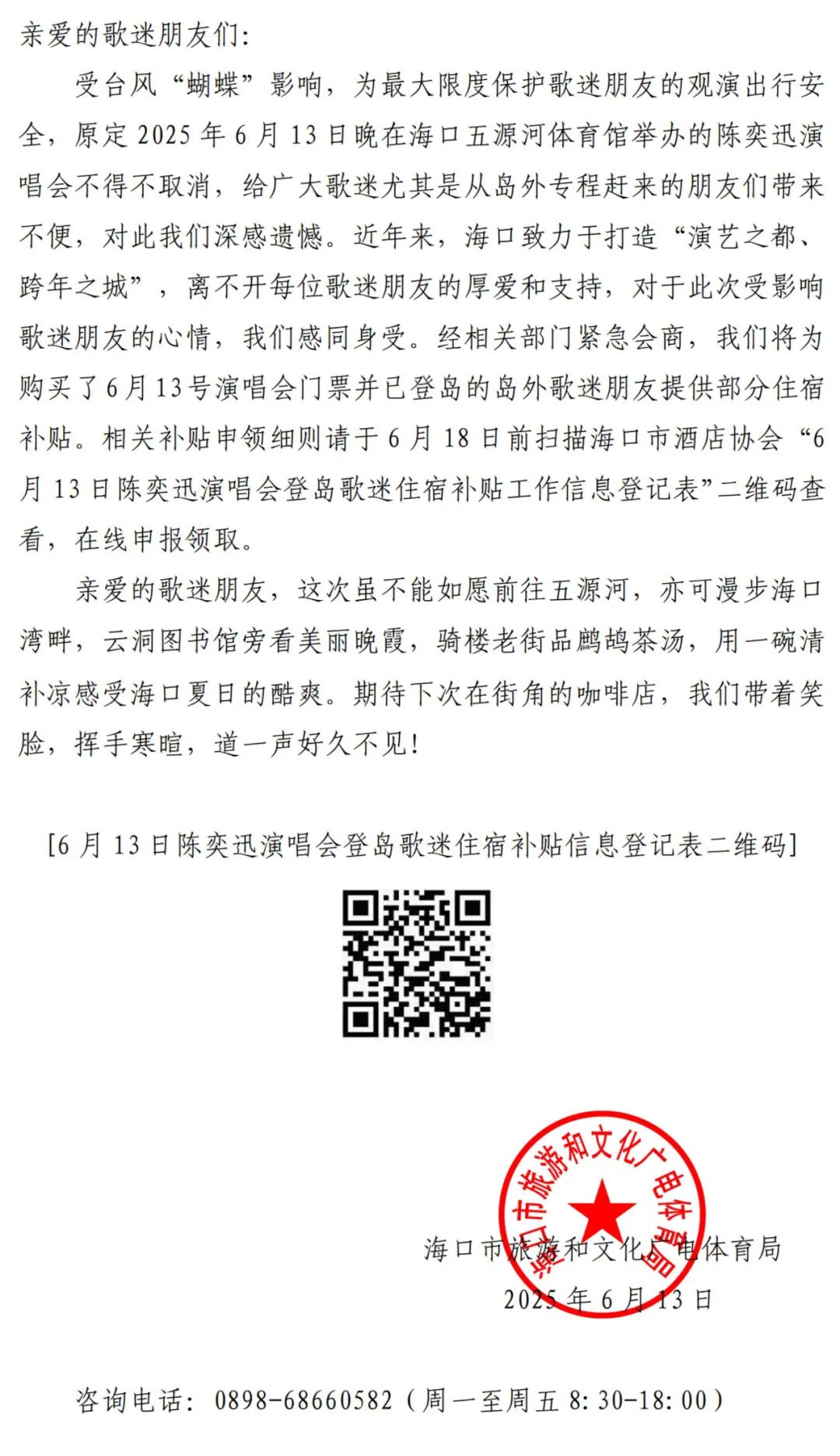 致受台风影响取消演出活动的登岛歌迷朋友的信
